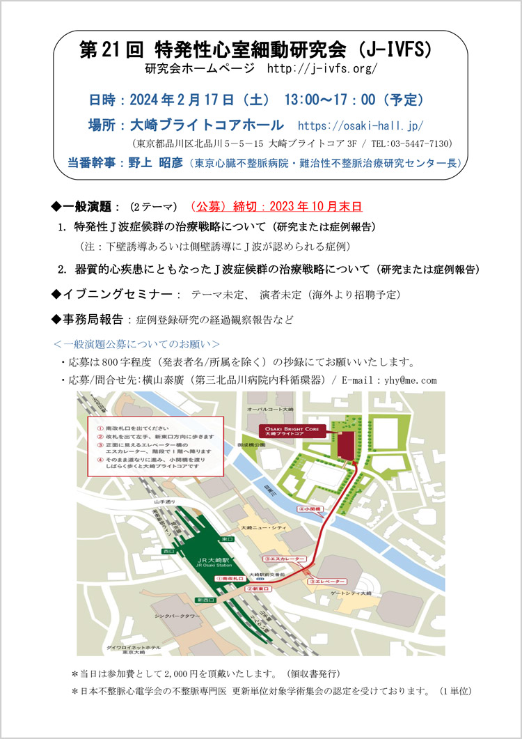 野上難治性不整脈研究センター長が当番幹事をつとめます第21回特発性心室細動研究会(J-IVFS)が大崎ブライトコアホールで開催されます。